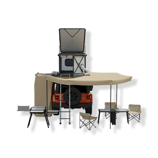 One-stop camping platform for SUVs. Includes roof rack, front wind diffuser with lights, auto Hybrid sleeping cabin, water tank (25L), SUV electric side steps, 270° manual awning, mobile kitchen, portable function table, and shower tent.