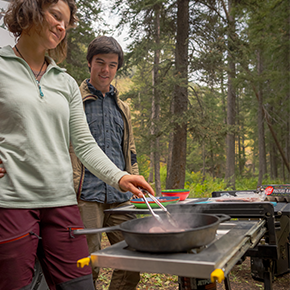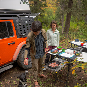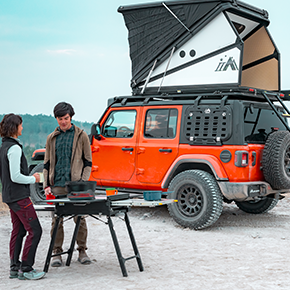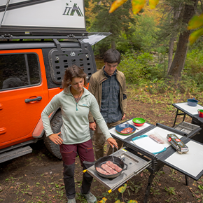 The Mobile Kitchen is a wilderness camping product that folds compactly for storage in a vehicle's cargo area. When deployed, it features a dual-zone cooking system with a barbecue grill on one side and a steaming/boiling module on the other. Designed for portability, it can be easily towed to any desired location.