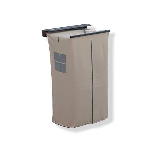 The primary material employs UV-resistant and high-abrasion-resistant polyester fabric, featuring a curtain door design. It is installed on a bed rack side panel and stores compactly in a portable case without occupying additional space.