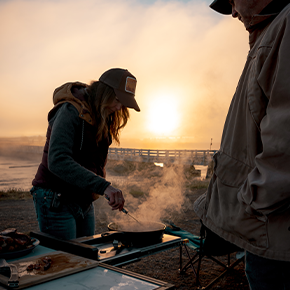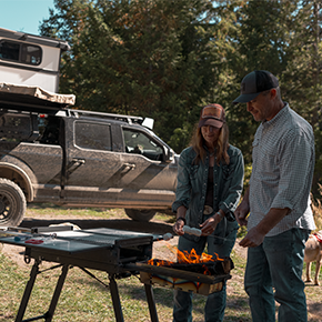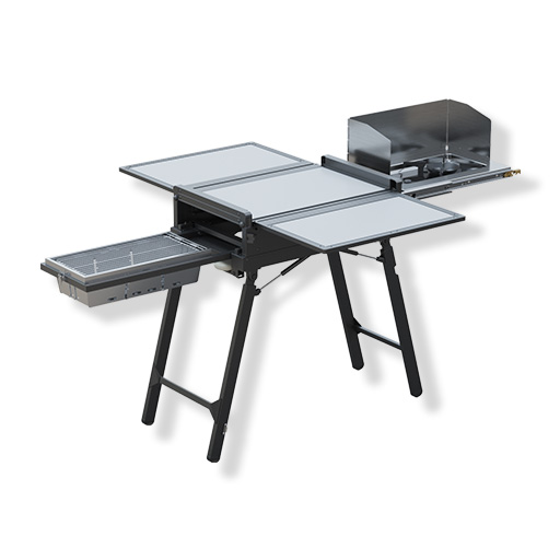 The Mobile Kitchen is a wilderness camping product that folds compactly for storage in a vehicle's cargo area. When deployed, it features a dual-zone cooking system with a barbecue grill on one side and a steaming/boiling module on the other. Designed for portability, it can be easily towed to any desired location.
