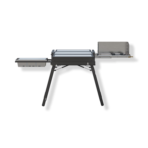The Mobile Kitchen is a wilderness camping product that folds compactly for storage in a vehicle's cargo area. When deployed, it features a dual-zone cooking system with a barbecue grill on one side and a steaming/boiling module on the other. Designed for portability, it can be easily towed to any desired location.