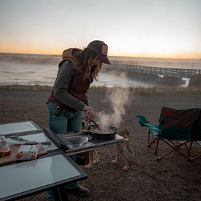 The Mobile Kitchen is a wilderness camping product that folds compactly for storage in a vehicle's cargo area. When deployed, it features a dual-zone cooking system with a barbecue grill on one side and a steaming/boiling module on the other. Designed for portability, it can be easily towed to any desired location.
